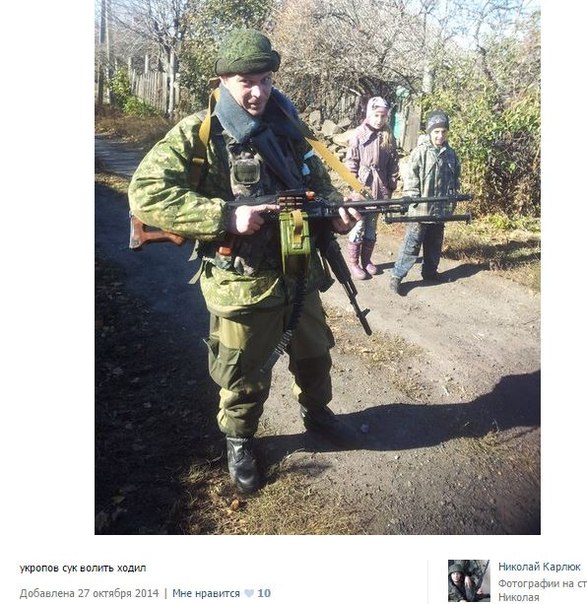 Сам он, приехал на Донбасс «косить укроп», и признается, что воюют только россияне, а местные ополченцы — говно, т.к «алкаши комерсы и нарки» . Сам их боится, поскольку в него стреляли «чаще ваши оолченцы нечаянно чем укропы».