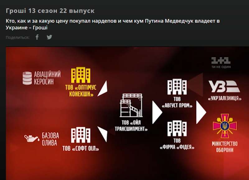 В прошлом году в показанной на «плюсах» программе «Гроші» Дубинского вышел разгромный сюжет на эту тему, в котором в поставках самодельного «керодизеля» Минобороны и «Укрзализныце» обвинили компании группы «Трейд коммодити» – «Август пром» и «Фирма Фидея».