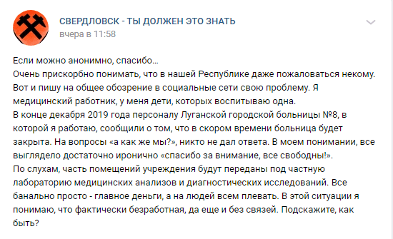 "В оккупированном Луганске предупреждают о возможном закрытии горбольницы. Как пишет анонимная пользовательница, представившаяся работницей горбольницы, учреждение в скором времени будет закрыто. В конце декабря 2019 года персоналу Луганской городской больницы №8, в которой я работаю, сообщили о том, что в скором времени больница будет закрыта. На вопросы "а как же мы?", никто не дал ответа. В моем понимании, все выглядело достаточно иронично "спасибо за внимание, все свободны!", — пишет она".