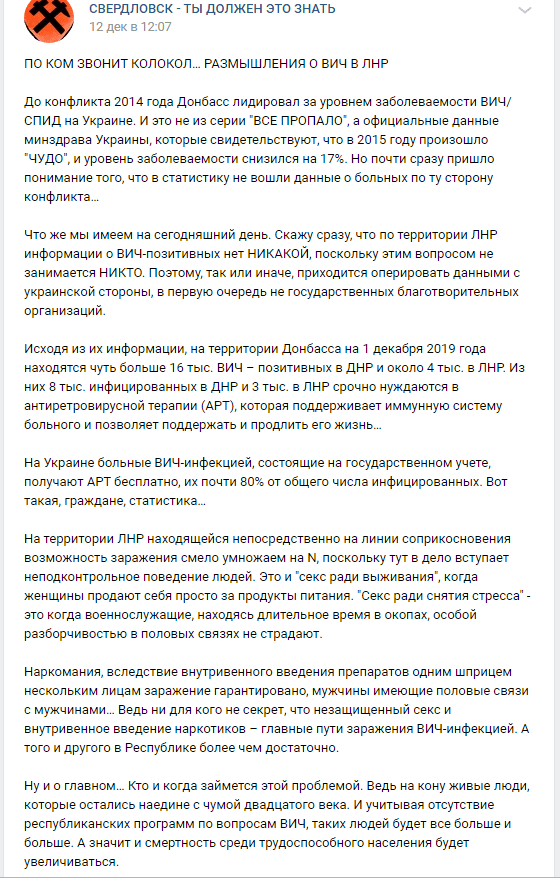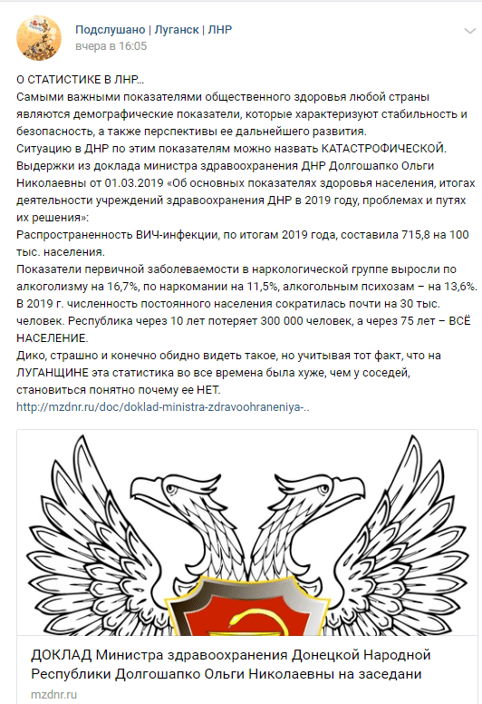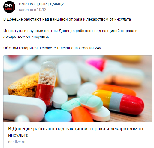 — в ОРДЛО через СМИ постоянно пишут о развитии медицины, о инновациях, победе над раком (да, в ОРДЛО заявили, что нашли вакцину от рака, СПИДа и других болезней), при этом, уровень лабораторий, это хорошо, что довоенный, в основном а-ля СССР.