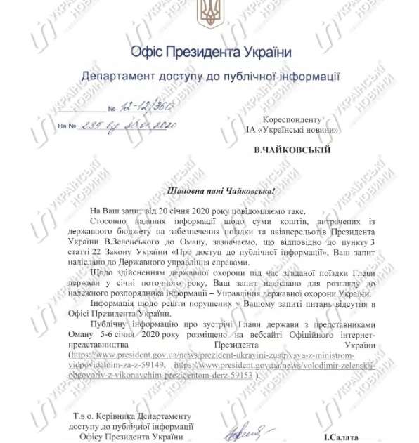 Отмечается, что в Офисе так и не ответили, по чьей инициативе был визит в Оман, и какими авиарейсами он осуществлялся. Также не была предоставлена информация о программе встречи или других мероприятиях в зарубежной стране.