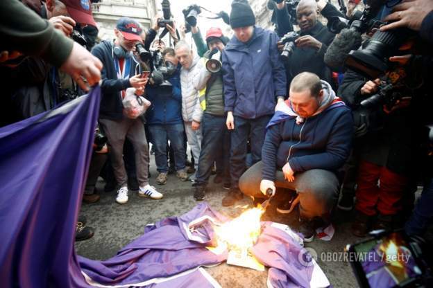 За несколько часов до выхода Британии из ЕС сторонники Brexit в центре города сожгли флаг Европейского союза. Это сделал мужчина, завернутый в флаг Великобритании. За ним наблюдала толпа людей, в том числе журналисты, передает агентство Reuters.