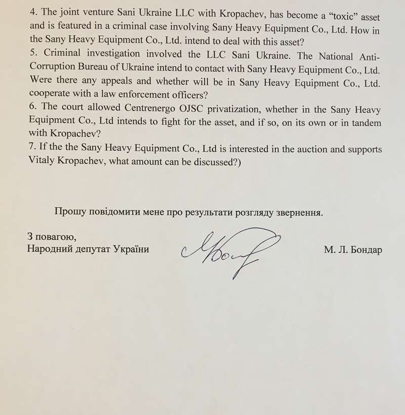 Инвесторы из Китая, которые якобы будут финансировать бизнес Кропачева для победы в приватизационном конкурсе «Центрэнерго», на самом деле давно уже отказались от него. Редакция 368.media обращалась с официальными запросами в Китайскую Торговую Ассоциацию, куда входило ООО «САНИ Украина, тяжелое оборудование», но там заявили, что не знают, куда пропала компания. Телефоны совместного украинско-китайского «Сани Украина», где директором был сам Кропачев, молчат. Не знают ничего о местонахождении компаний даже в посольстве КНР В Украине. Там так и не ответили на запрос народного депутата Михаила Бондара о данных предприятиях