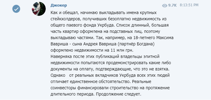 «Як і обіцяв, починаю викладати імена великих стейкхолдерів, які отримали безоплатно нерухомість із загального пайового фонду Укрбуду. Список довгий, велика частина квартир оформлена на підставних осіб, тому викладаю частинами. Так, наприклад, на 18-річного Максима Вавриша - сина Андрія Вавриша (партнера глави Офісу президента Андрія Богдана) оформлено нерухомості на 11 млн грн», - пише пранкер Джокер.