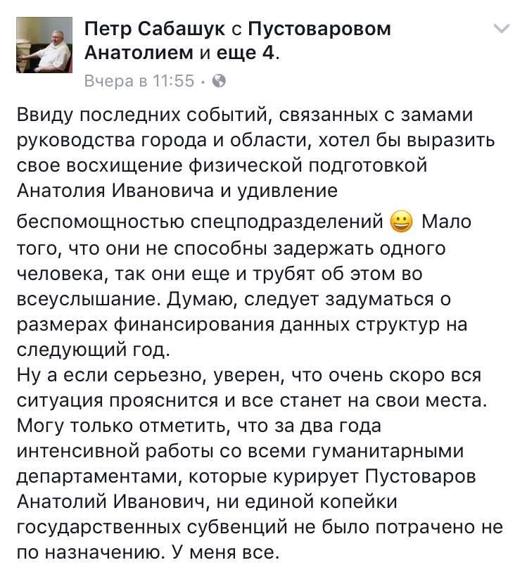 Местный бюджет громады получал «дырку от бублика», а сверхприбыль делилась. Вот и подключили Сабашука: «Могу только отметить, что за два года интенсивной работы со всеми гуманитарными департаментами, которые курирует Пустоваров Анатолий Иванович, ни единой копейки государственных субвенций не было потрачено не по назначению. У меня все». Пост в Фейсбуке спустя какое-то время пропал, но скриншоты не горят.