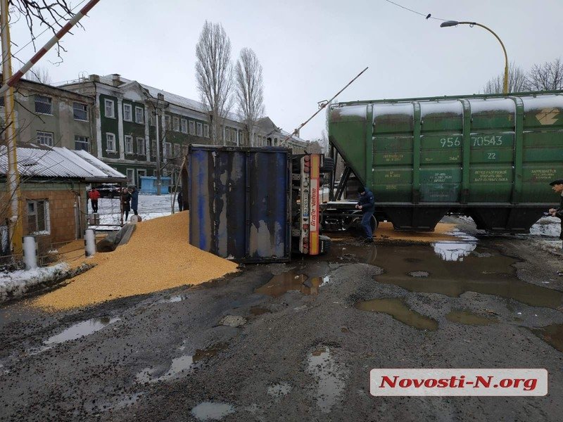 Днем в четверг, 6 февраля, на ул. Индустриальной в Николаеве вагон поезда с зерном столкнулся с автомобилем-зерновозом.