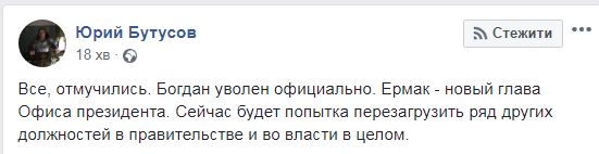А журналист Юрий Бутусов прогнозирует, что после смены руководителя Офиса президента будет предпринята попытка «перезагрузить ряд других должностей в правительстве и во власти в целом».