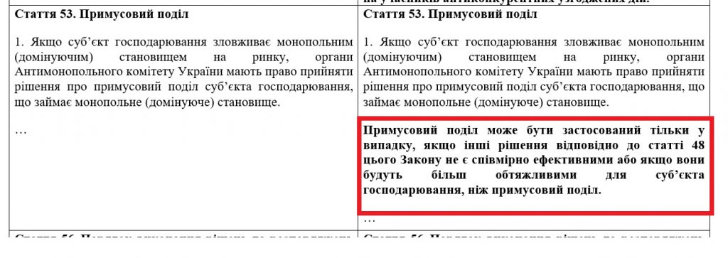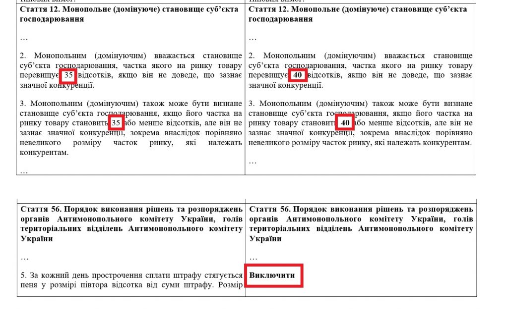Документ последней комплексно перестраивают работу АМКУ в части изменения подотчетности, изменения территориальных органов, назначения уполномоченных и т. п. В пояснительной записке к своему законопроекту Павлюк указывает, что проект Пидласы неоправданно усиливает АМКУ, тогда как его – направлен наоборот на встречу бизнесу. В этом направлении Павлюк предлагает сделать как минимум два ключевых шага: увеличить процент, определяющий монопольный статус с нынешних 35 до 40% и отказаться от начисления пени, которая сейчас составляет 1,5% за каждый день неуплаты штрафа (но не больше размера самого штрафа).