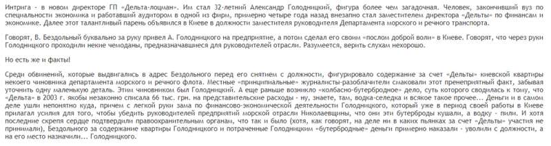 Назначению Голодницкого, который до этого работал бухгалтером-аудитором, сильно противился коллектив предприятия, устраивая акции протеста, однако это не помогло — под охраной милицейских спецподразделений «Беркут» и «Грифон» его официально представили подчиненным. Интересно на этом фоне выглядят финансовые результаты предприятия — в 2005 году его чистая прибыль составляла около 240 тыс. гривен и буквально за год упала до примерно 140 тыс. гривен.
