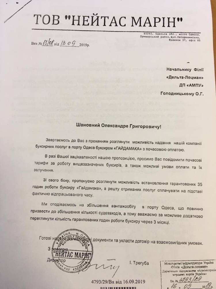 В 2019 году имя Александра Голодницкого снова «всплыло» в коррупционном скандале, на этот раз он приобщился к внедряемым чиновниками АМПУ «буксирным» схемам в портах — ООО «Нейтас Марин» скандально известного бизнесмена Анатолия Шестаковского решила арендовать у «Дельта Лоцмана» отремонтированный за государственные средства буксир «Гайдамака», согласившись при этом гарантированно оплачивать лишь 35 часов его работы.