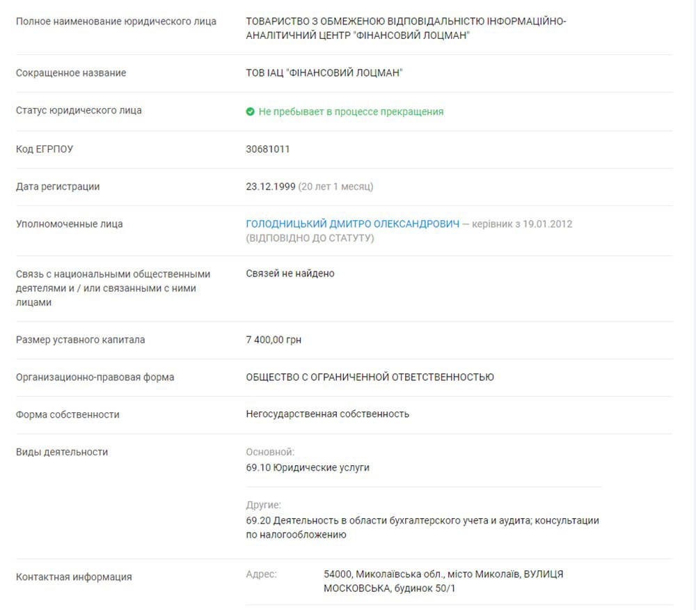 Интересные моменты можно увидеть и в декларации Александра Голодницкого за 2018 год. К примеру, он почему-то не внес туда своего сына Дмитрия Голодницкого. Полный его тезка, Дмитрий Александрович Голодницкий, с января 2012 года возглавляет николаевское ООО «Информационно-аналитический центр «Финансовый лоцман», но функции его, как руководителя, сильно ограничены уставом предприятия, а уставной фонд составляет всего 7,4 тыс. гривен.