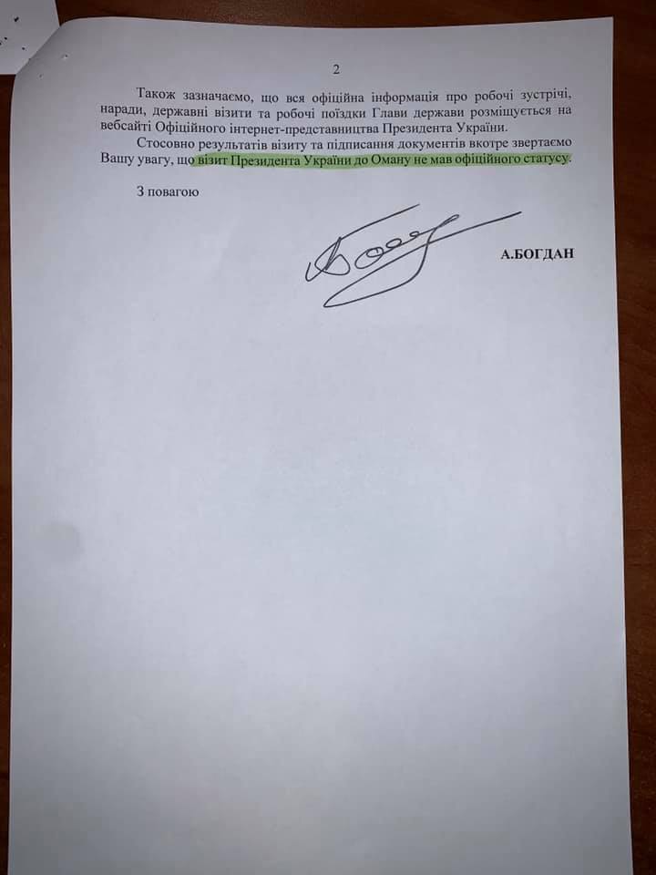 В документе говорится, что поездка Зеленского к Султанату Омана осуществлялась с частной целью и за собственные деньги. Также в письме подчеркнули, частное путешествие предусматривает личные расходы на него, информация о которых должна быть опубликована в декларации.