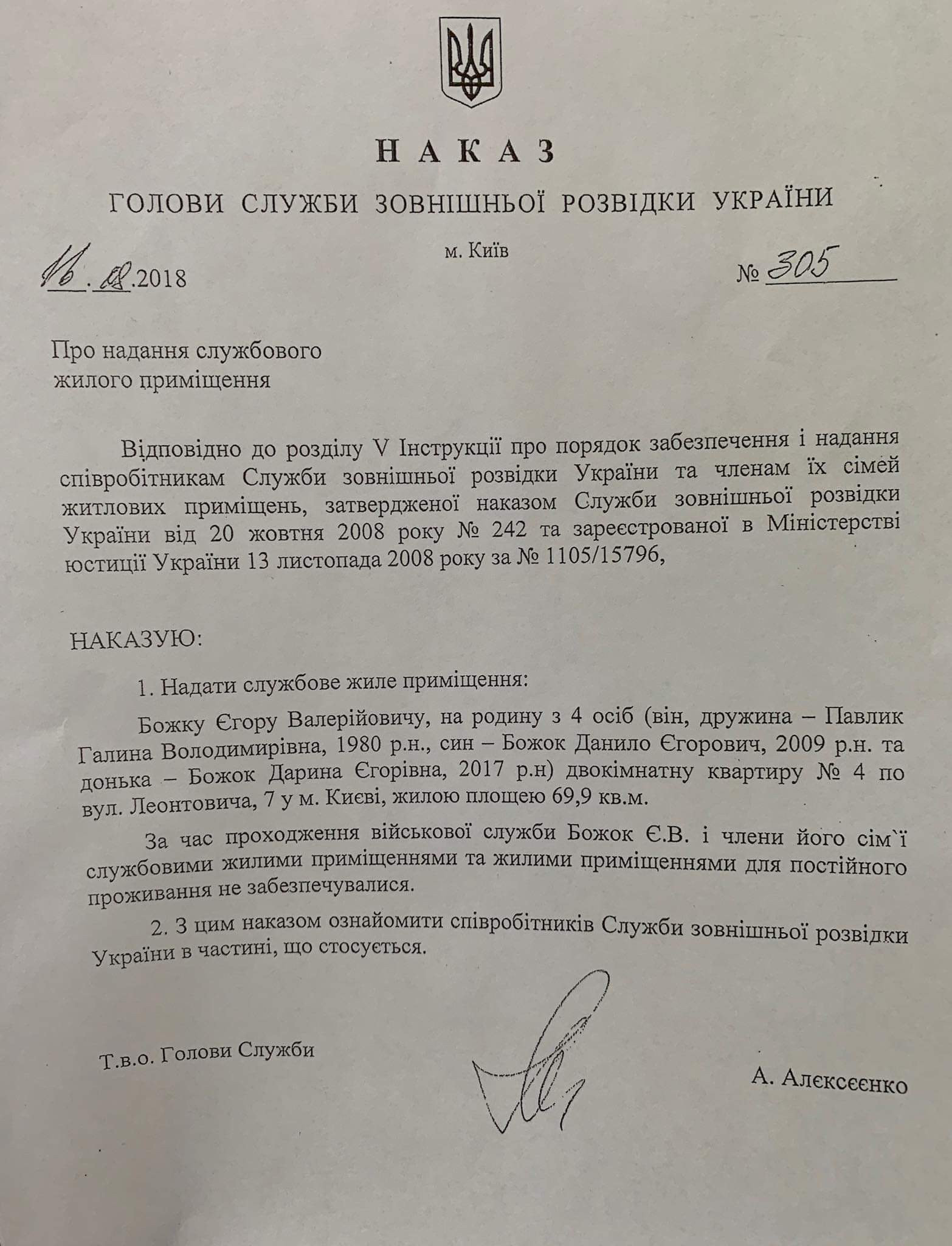 Согласно приказу врио Главы Службы внешней разведки Украины Андрея Алексеенко в августе 2018 года, двухкомнатную квартиру в Киеве было передано в служебное пользование сотруднику Службы Егору Валериевичу Божку.