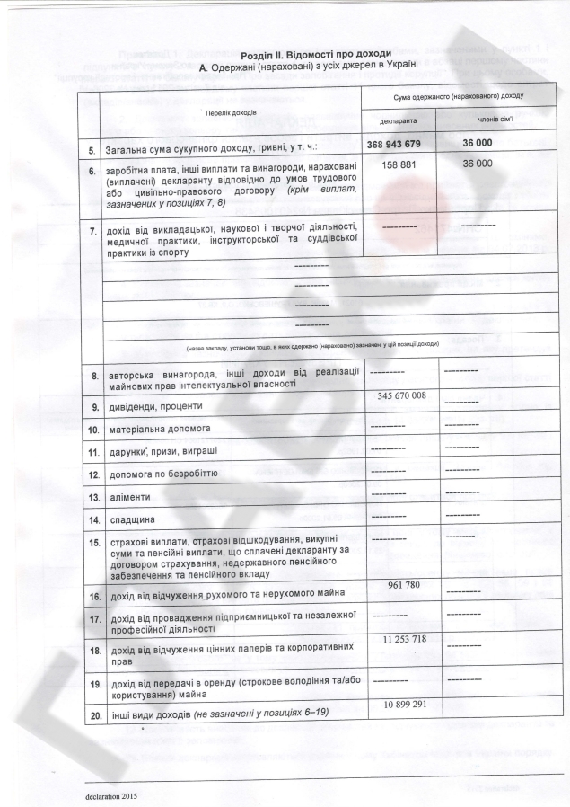 Для сравнения, в 2013 году доходы Петра Порошенко составили 51,83 млн грн, а членов его семьи – 52 тыс. грн. В 2013 году зарплаты, вознаграждения Порошенко составляли 240 тыс. грн, дивиденды, проценты – 13,53 млн грн, доходы от отчуждения ценных бумаг и корпоративных прав – 38,06 млн грн. На счетах в банках у Порошенко в 2013 году было 114 млн грн, у членов его семьи – 105 тыс. грн.