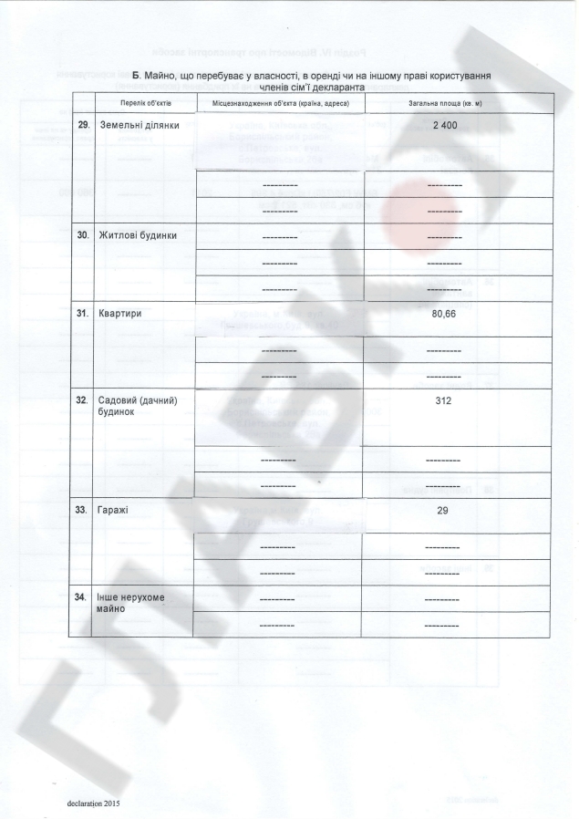 Президент также задекларировал 5 земельных участков общей площадью около 47 тыс. кв. м. А также три квартиры площадью 134,82 и 68 кв. м. Семья Порошенко также владеет землей 2400 кв. м, квартирой 80 кв.м, а также домом 312 кв.м.