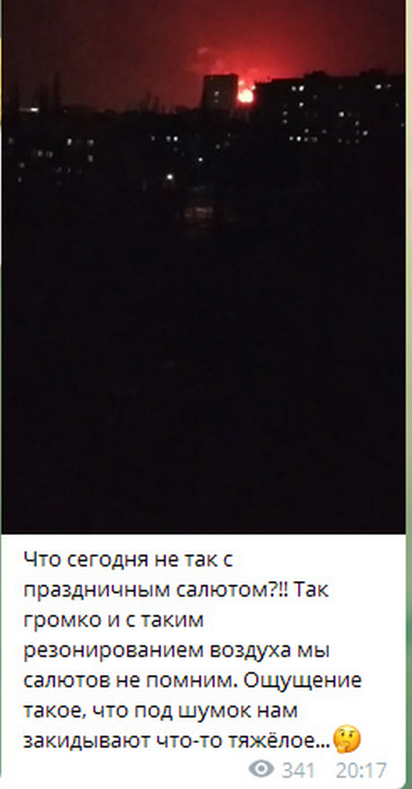 «Всем спокойно — это салют. В Донецке ко Дню защитника Отечества громкий, мощный, раскатистый, как будто с „выходом“ и „приходом“ салют. Потому что запускают его из гаубицы Д-30 в самом центре города, в парке им. Щербакова, как и всегда, в праздничные дни», — написали «официальные» сайты террористов.