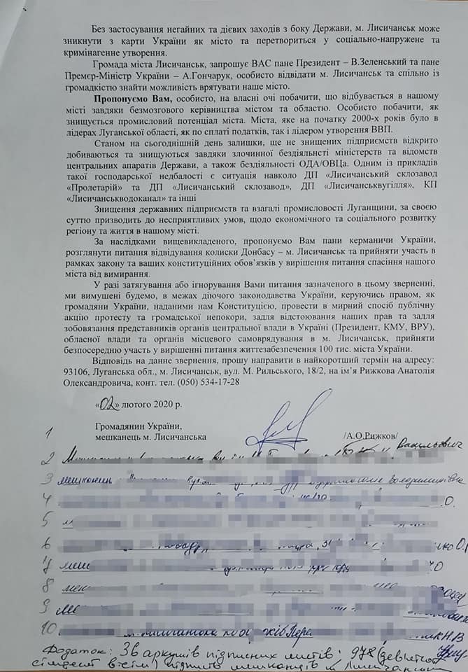 «Друзья, мы собрали подписи под обращением на имя президента Украины в котором говорим о проблемах города и которым приглашаем его посетить наш город с визитом. Обращение подкрепленные 978 подписями жителей города отправлено адресату. Первый шаг нами сделан. В случае игнорирования обращения, сделаем второй шаг?!», — написал Рыжков.