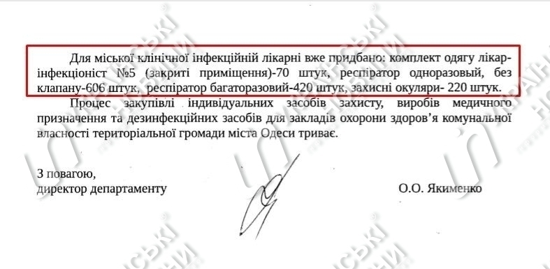 Департамент охраны здоровья Одесского городского совета сообщил, что с целью обеспечения готовности учреждений здравоохранения города для оказания медицинской помощи лицам, у которых могут быть выявлены признаки инфицирования коронавирусом COVID-19, были закуплены индивидуальные средства защиты, изделия медицинского назначения и дезинфицирующие средства, в том числе 220 пар защитных очков.