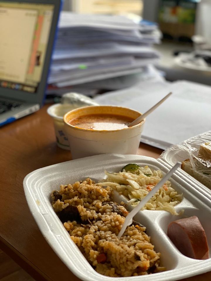Також міністр поділилася фотографіями обіду: борщ зі сметаною, плов, овочевий салат та ковбаса.