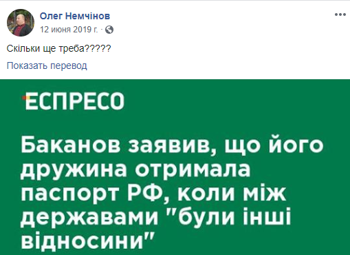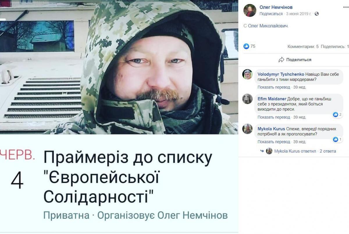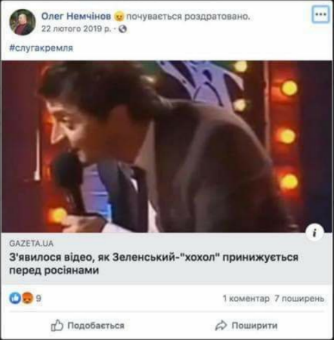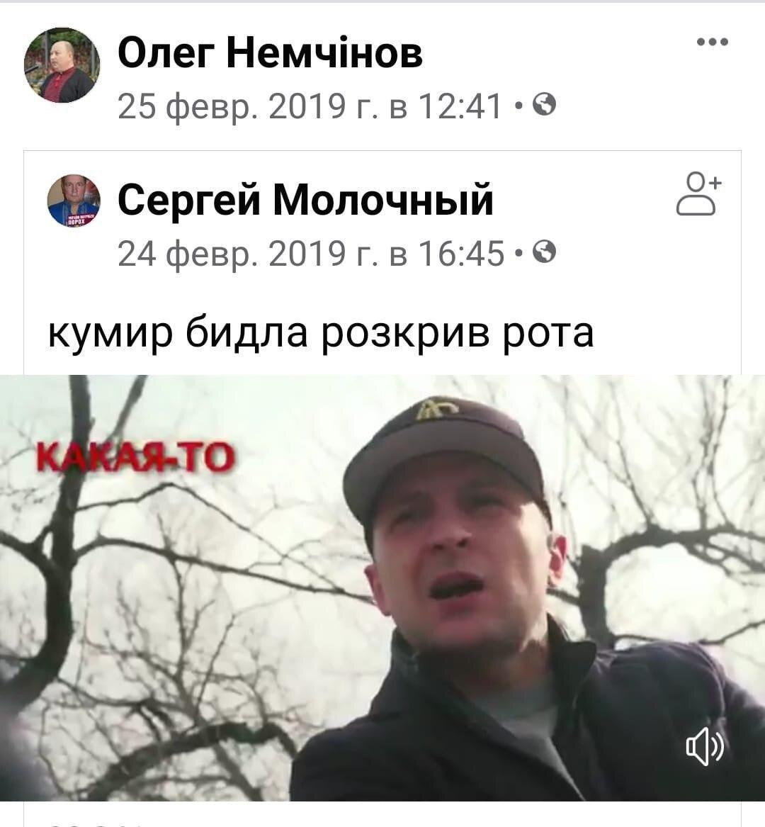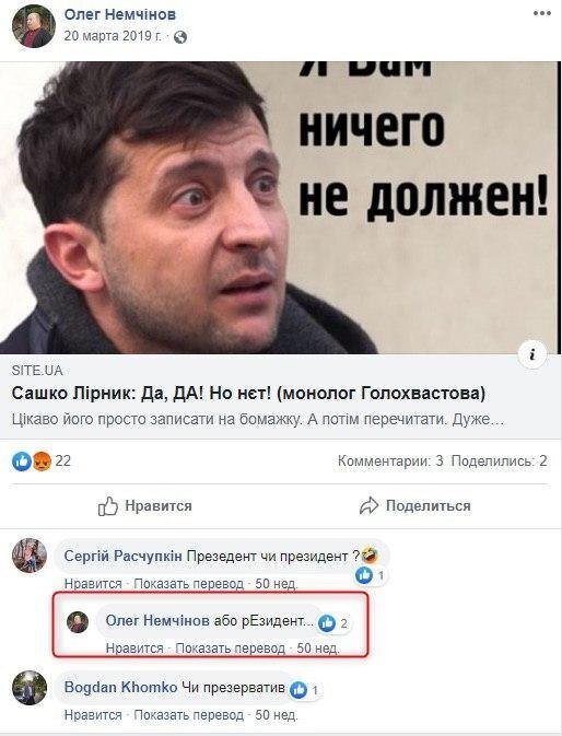 Так, Немчинов называл Зеленского "слугой Кремля" и "резидентом", постил материалы, в которых президента окрестили "кумиром быдла" и высказывал сомнения касательно его преданности стране.