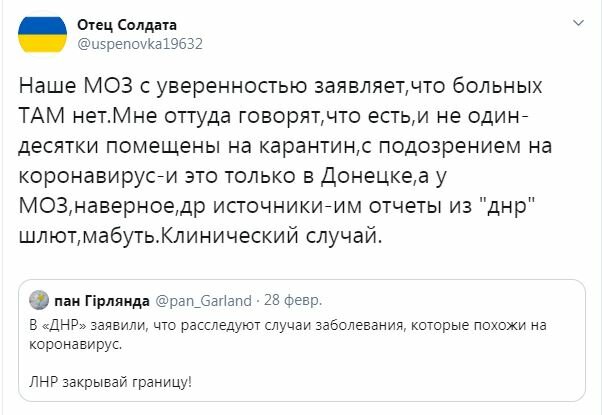 Более того, люди, имея инсайдерскую информацию утверждают, что в ОРДЛО уже десятки человек помещены в карантин с подозрением на смертельный коронавирус.