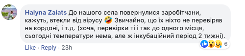 "В наше село вернулись работники, говорят, сбежали от вируса. Конечно, их никто не проверял на границе и т. д. (хотя проверки те и так до одного места, сегодня температуры нету, но инкубационный период 2 недели)", - написала в Facebook львовянка Галина Заяц.