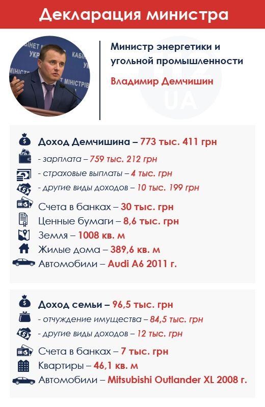Заработки Владимира Демчишина за 2014 г. – 773,4 тыс. грн. Почти всю эту сумму составляет зарплата. И по этому показателю (759 тыс. грн) Демчишин занимает второе место после Айвараса Абромавичуса. На счетах у Демчишина скромные 30 тыс. грн, однако есть земельный участок, большой дом и автомобиль Audi A6. Еще одна машина и квартира записаны как собственность семьи. В 2013 г. доход нынешнего министра составлял более 2,2 млн грн. Владимир Демчишин до министерского кресла возглавлял Национальную комиссию регулирования энергетики. До назначения в НКРЭ был директором отдела инвестиционно-банковских услуг группы "Инвестиционный капитал Украина" (ICU). К слову, нынешняя глава Нацбанка Украины Валерия Гонтарева ранее возглавляла совет директоров ICU. До ICU Демчишин работал вице-президентом банка ING, менеджером отдела корпоративных финансов компании Ernst & Young.