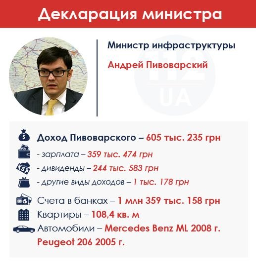 Министр инфраструктуры Андрей Пивоварский задекларировал за 2014 г. 605 тыс. грн дохода: 360 тыс. грн зарплаты и 244 тыс. грн дивидендов. На счетах у министра 1,36 млн грн, квартира и два автомобиля. Андрей Пивоварский – опытный топ-менеджер. В свое время поработал на видных должностях в Dragon Capital и группе "Континиум". С 1998 по 2001 гг. работал на должности финансового аналитика и бизнес-девелопера в киевской инвестиционной группе BLASIG, где разрабатывал и курировал ряд проектов с объемом инвестиций 10 млн долл. Позже работал в московском офисе IFC, где управлял инвестиционным портфелем по Центральной и Восточной Европе в размере 100 млн долл. В 2006 г. Пивоварский присоединился к Dragon Capital. На должности директора инвестиционно-банковского департамента отвечал за сектора розничной торговли, строительства, IT и СМИ. За время работы в Dragon Capital провел несколько видных IPO в Украине, включая размещение акций таких компаний, как Davento (девелоперское подразделение, "Велика Кишеня"), "Фуршет", KP Media и Clubhouse (оператор сети гостиниц). В конце 2012 г. Пивоварский стал гендиректором группы "Континиум" (заправки WOG, ТМ "КОМО", молочная компания "Галичина").