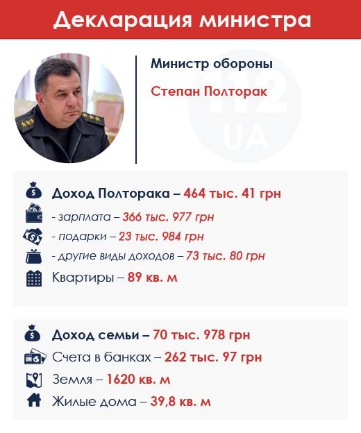 Министр обороны Украины в 2014 г. заработал 464 тыс. грн. Кроме зарплаты, составившей львиную долю этой суммы, Полторак также указал 24 тыс. грн подарков (призов или выигрышей) и 73 тыс. "других доходов". Семья Полторака заработала 70 тыс., еще 262 тыс. лежит на банковских счетах. У семьи Полтораков есть дом и квартира.