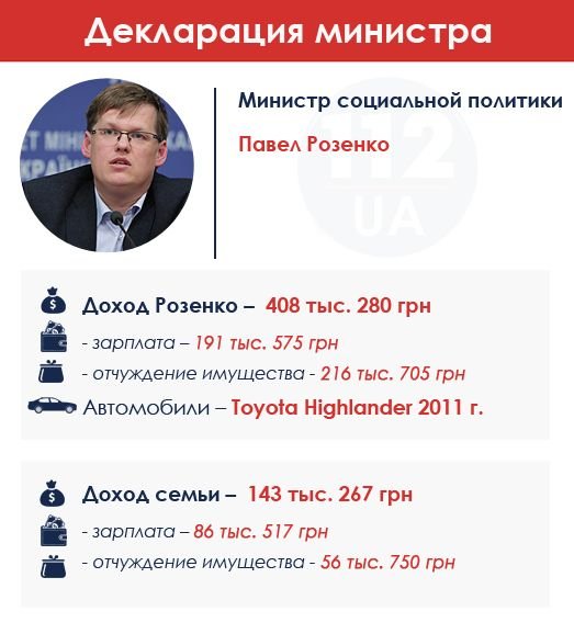 Министр соцполитики за год заработал 408 тыс. грн, и не в последнюю очередь за счет продажи имущества на 216 тыс. грн. Какой-либо недвижимости у министра, судя по декларации, нет. В декларации за 2013 г. указывалось, что Розенко не обладает никаким недвижимым имуществом, а имеет лишь автомобиль Mercedes-Benz ML 430 2000 года выпуска. Зато в 2014 г. он задекларировал приобретение за 389,1 тыс. грн автомобиля Toyota Highlander 2011 года выпуска. Однако ездит на нем Розенко не часто. Сам он говорил, что ездит на работу в метро.