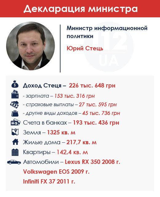 Министр информполитики Юрий Стець получил в 2014 г. 226 тыс. грн (на счетах в банке у него 193 тыс. грн). У министра два участка, дом, три квартиры и три авто: Lexus RX350, Wolksvagen EOS и Infiniti FX 37. Интересно, что Стець не пожелал указывать в декларации свою семью и ее доходы. Хотя жена у него — Яна Конотоп — журналист, политический обозреватель на "5 канале", заслуженный журналист Украины. У Стеця есть два сына – Владислав и Серж – и дочь Ева.