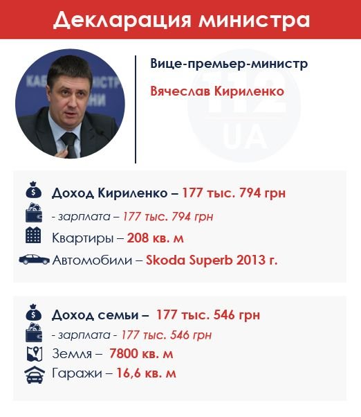Вице-премьер и министр культуры Вячеслав Кириленко в 2014 г. заработал 177 тыс. грн. Согласно декларации, вся эта сумма получена от зарплаты. Почти такую же сумму задекларировала и семья чиновника. И это также зарплата. Кириленко имеет две квартиры (на 53 и 155 квадратов), земельный участок на 0,78 гектара и гараж на 16,6 кв. м. Ездит чиновник на Skoda Superb 2013 года выпуска. Также Кириленко имеет кредитные обязательства на 208 тыс. грн. Примечательно, что в 2013 г., согласно декларации, Кириленко и его семья жили также исключительно на зарплату и выплачивали кредит.