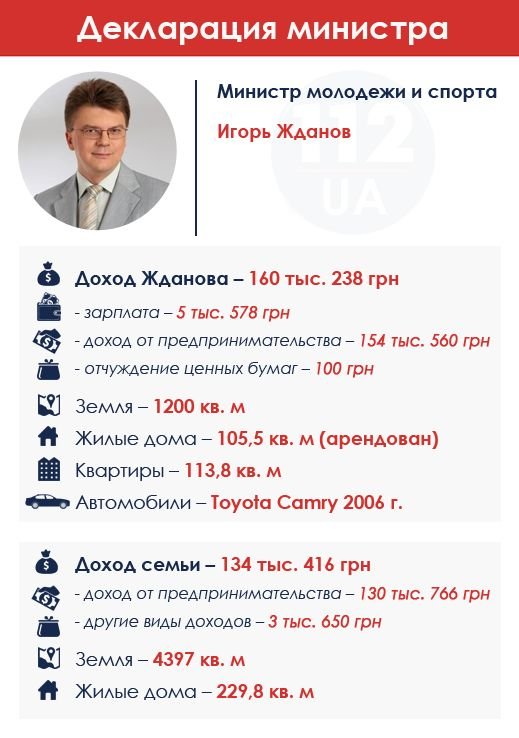 Министр молодежи и спорта Игорь Жданов задекларировал 160 тыс. грн доходов в 2014 г. Основной источник дохода Жданова и его семьи – предпринимательская деятельность. Она принесла семье министра почти 300 тыс. грн. В собственности Жданова указан земельный участок площадью 0,12 га, квартира площадью 113,8 кв. м и автомобиль Toyota Самгу 2006 года выпуска. Также министр в сентябре-декабре 2014 г. арендовал дачный дом площадью 105,5 кв. м за 24 тыс. грн. В собственности семьи находятся 2 земельных участка общей площадью 0,19 и 0,25 га и жилой дом площадью 229,8 кв. м. Каким именно предпринимательством занимался Жданов, он не указывает.