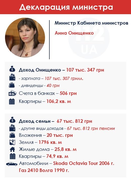 Министр Кабинета министров Анна Онищенко задекларировала 107 тыс. грн доходов в 2014 г. Собственно, это зарплата и сразу 40 грн дивидендов. Онищенко владеет квартирой площадью 106,2 кв. м. В 2013 г. она приобрела за 979 тыс. грн квартиру в Киеве. Ее семья владеет 2 земельными участками площадью 1 тыс. 250 и 546 кв. м, жилым домом - 25,8 кв. м и квартирой - 74,92 кв. м. Также родители Онищенко владеют автомобилями Skoda Octavia Tour и ГАЗ-2410 Волга. Отметим, по итогам 2013 г. Онищенко стала самой бедной в Кабмине - ее доходы, согласно поданной декларации, составили всего 35,1 тыс. грн. (менее 3 тыс. грн в месяц). Предыдущая деятельность Онищенко ограничивалась сферой юриспруденции. Еще будучи студенткой, с мая 2004 г. работала юрисконсультом в Киевском филиале ООО "Юридическая фирма "А-Лекс" и затем в столичном представительстве "ПриватБанка". В марте 2007 г. перешла на должность юриста в ЗАО "Столичная юридическая группа".