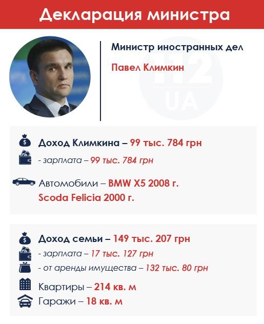 Министр иностранных дел Павел Климкин задекларировал 99,7 тыс. грн доходов в 2014 г. Всю сумму доходов министра составила заработная плата. Члены семьи Климкина (жена и 2 сына) задекларировали 149 тыс. грн доходов. В собственности членов семьи Климкина находится две квартиры площадью 49,5 кв. м и 164,5 кв. м, а также гараж. Ездит министр на BMW X5 2008 года выпуска, также у него есть Skoda Felicia 2000 года выпуска. Климкин и члены его семьи не имеют денег на счетах в банках. Климкин – дипломат с большим стажем.