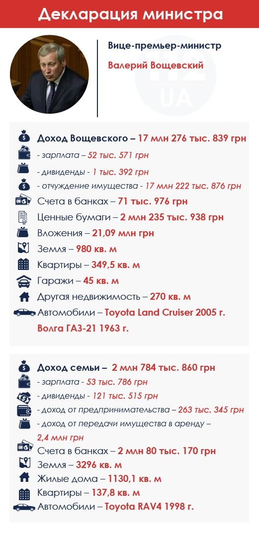 Однако что продавал вице-премьер, он не сообщил. У Вощевского и его семьи в собственности четыре квартиры, дача, гараж и три автомобиля: Toyota Land Cruiser, "Волга" ГАЗ-21 и Toyota RAV4. На счетах в банках есть 71,9 тыс. грн у Вощевского и 2,2 млн грн – у семьи. Еще 2,2 млн грн Вощевский держит в ценных бумагах. В статутный капитал предприятий вице-премьер ранее внес 21 млн грн. Вощевский успел выделиться среди других членов правительства уже в день своего назначения.