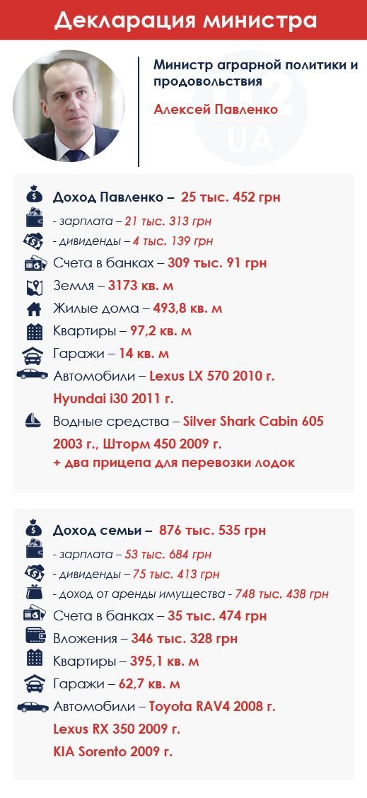 Министр аграрной политики Алексей Павленко своей декларацией показывает, как можно зарабатывать по 25 тыс. грн в год (2 тыс. грн в месяц) и владеть домами, квартирами, представительскими автомобилями и катерами. Павленко задекларировал 25 тыс. грн доходов в 2014 г. Доход членов семьи министра (жена, сын и дочь) значительно больше - 876 тыс. грн (в основном от продажи имущества).