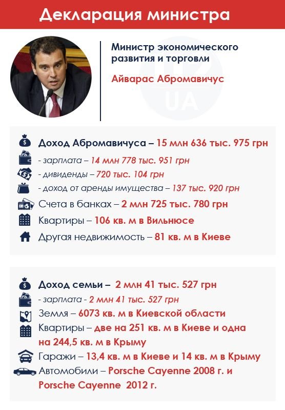 При этом зарплата Абромавичуса составила 14,8 млн грн. Эта цифра не идет ни в какое сравнение с "мизерными" зарплатами украинских министров. При этом его совсем не пугает маленькая зарплата украинского чиновника: мол, за 18 лет успешной инвестиционной деятельности он заработал достаточно, чтобы не интересоваться этим вопросом. Абромавичус также задекларировал две квартиры: в Вильнюсе площадью 106 кв. м и в Киеве - 81 кв. м. Автомобилей, согласно декларации, у министра нет, однако в распоряжении членов семьи находятся два Porsche Cayenne 2008 и 2012 г. в.