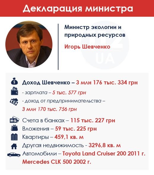 Министр экологии по итогам 2014 г. отчитался о 3,17 млн грн заработка. При этом министерская зарплата составила 5,5 тыс. грн. Остальное – прибыль от предпринимательской деятельности. У Шевченко есть три квартиры и 3,3 тыс. кв. м другой недвижимости, а также два автомобиля представительского класса. Шевченко до ухода в Кабмин зарабатывал на адвокатской деятельности. Еще в 1991 г. он попал на работу в юридическую фирму "Легис", руководителем которой в то время был Александр Чалый, затем в фирму "Фришберг и Партнеры". Стажировался в посольстве Украины в Брюсселе, Антимонопольном комитете Украины и юридической фирме "Василь Кисиль и Партнеры".