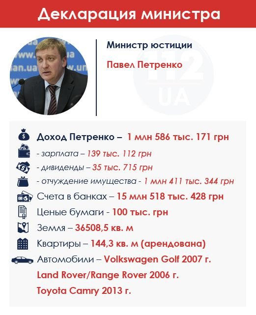 В 2013 г. министр юстиции заработал 3 млн грн, половина из которых – результат продажи имущества. В прошлом году его доход упал в два раза – до 1,58 млн грн. Почти всю сумму составила продажа имущества, зарплата министра – менее 140 тыс. грн.