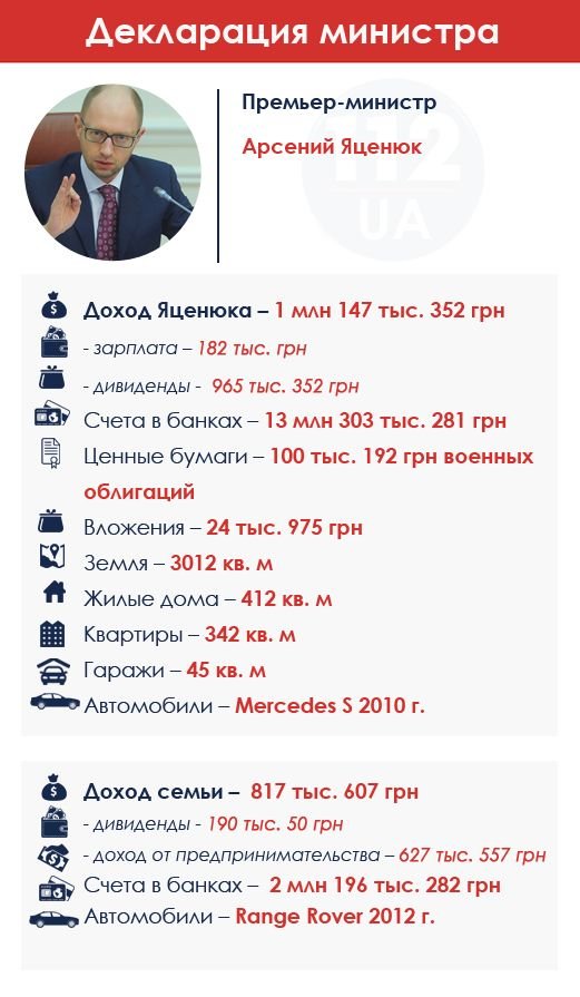 Премьер-министр Арсений Яценюк по официальным заработкам разместился вне первой пятерки. За прошлый год он заработал 1,1 млн грн, из которых почти миллион составили дивиденды. Семья премьера заработала 817 тыс. грн - преимущественно на предпринимательской деятельности. В банках у премьера лежит 13,3 млн грн, еще 2,2 млн хранит в банках семья. Согласно декларации о доходах премьера за 2013 г., размер его банковских вкладов составлял 6,61 млн грн, его жены - 1,06 млн грн.