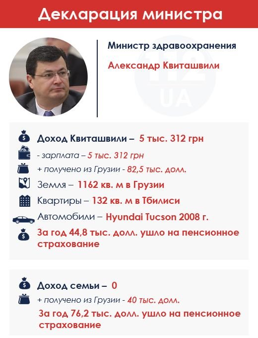 Грузинский министр здравоохранения Сандро Квиташвили за год заработал 82,5 тыс. долл. в Грузии и 5,3 тыс. грн в Украине. В гривну декларант свои доходы не удосужился перевести, и мы не будем, поскольку угадать курс здесь очень сложно. Наталья Яресько считала свои доходы по 11 грн за доллар, реальный же курс - около 25 грн за доллар. Члены семьи Квиташвили заработали в Грузии еще 40 тыс. долл. У министра есть участок земли на родине 1,1 тыс. кв. м и квартира в Тбилиси. Ездит Квиташвили на Hyundai Tuscon. Квиташвили и его семья направили 121 тыс. долл. на пенсионное страхование. Проследить, где работал Квиташвили до назначения на министерский пост в Украине, довольно сложно. Биография министра довольно скудна. Известно, что в 2010-2013 гг. он был ректором Тбилисского университета. В 2013 г.