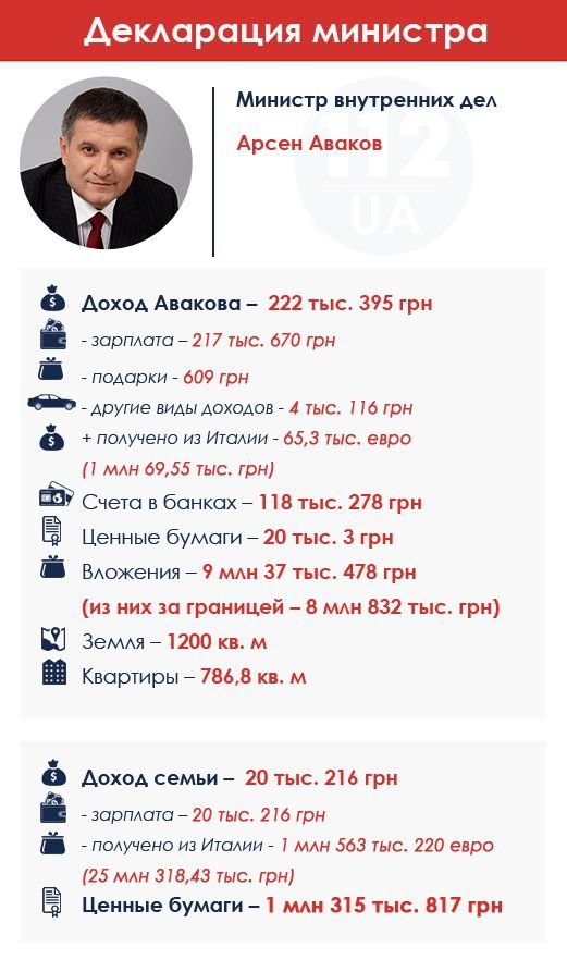 Показал свои иностранные доходы и министр внутренних дел Арсен Аваков, который имеет бизнес в Италии. Так, за прошлый год он заработал там 65,3 тыс. евро (чуть более 1 млн грн). А семья министра там же получила 1,56 млн евро (25,3 млн грн в пересчете). В Украине доходы Авакова намного скромнее: 222 тыс. грн, почти все – зарплата. У Авакова три квартиры общей площадью 786 кв. м, земельный участок и 118 тыс. грн на счетах в банках. 9 млн грн Аваков инвестировал в предприятия, почти всю сумму - за рубежом (очевидно, в Италии).
