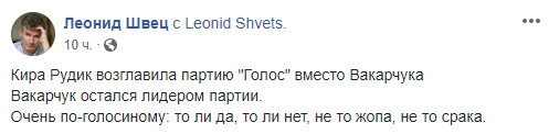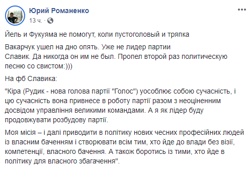 Журналист и блогер Юрий Романенко пишет, что Вакарчук по сути никогда и не был лидером партии.