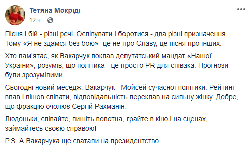 Журналист, политтехнолог Татьяна Мокриди считает, что каждый должен заниматься своим делом, и напомнила об предыдущем уходе Вакарчука из большой политики.