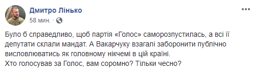 Доброволец АТО, политик Дмитрий Линько уверен, что Вакарчуку должно быть стыдно за свой поступок.