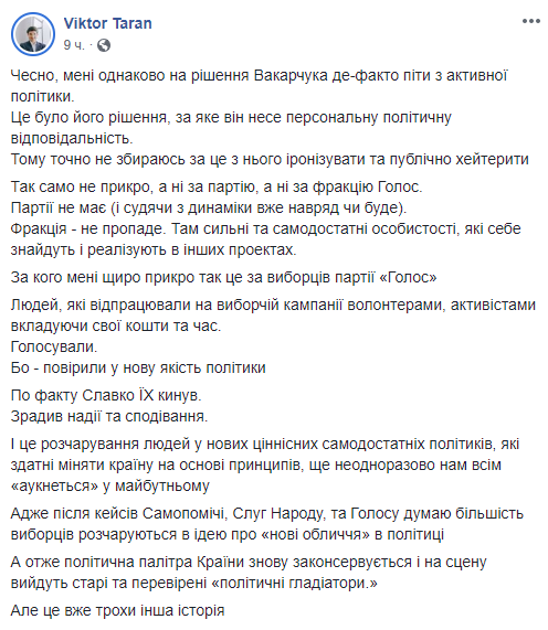 Политолог Виктор Таран жалеет избирателей “Голоса”, считая, что Вакарчук их попросту “кинул”.