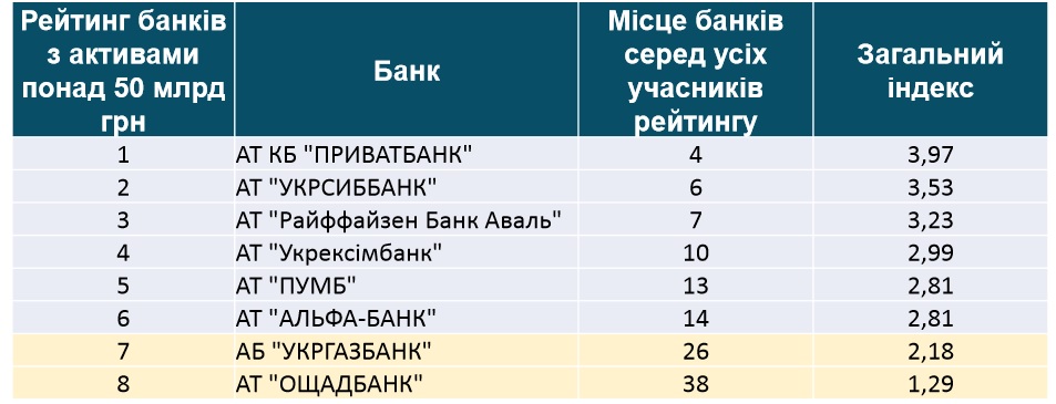 В частности, есть значительный разрыв между шестым, седьмым и восьмым местами в рейтинге банков с активами более 50 миллиардов гривен: