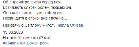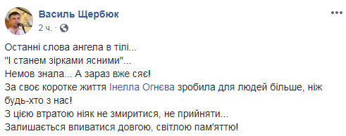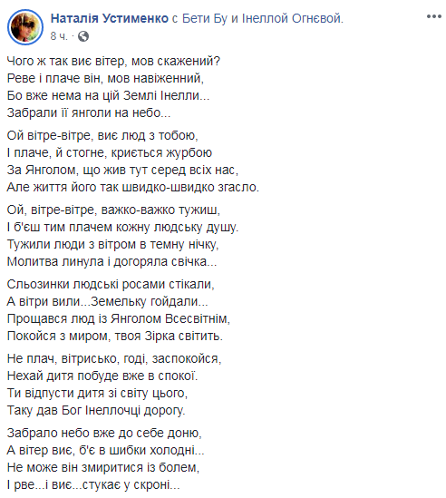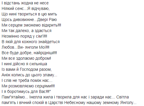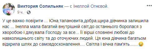 "Инелла жила и творила для нас", "Она была земным ангелом. И сделала за свою короткую жизнь для людей больше, чем любой из нас", "С этой потерей никак не смириться", "Трудно поверить. Ее стихи полны любви к окружающему миру и к окружающим людям . Эта юная девушка многим открыла путь к самосовершенствованию", "Вечная боль. Ангелы нас оставляют", "Ее называли "молодой Линой Костенко", "Она была лучшей среди нас", - написали неравнодушные.