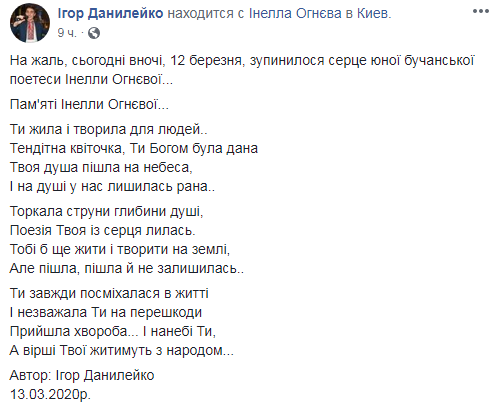 В четверг ночью, 12 марта, в городе Буча под Киевом умерла юная украинская поэтесса Инелла Огнева.